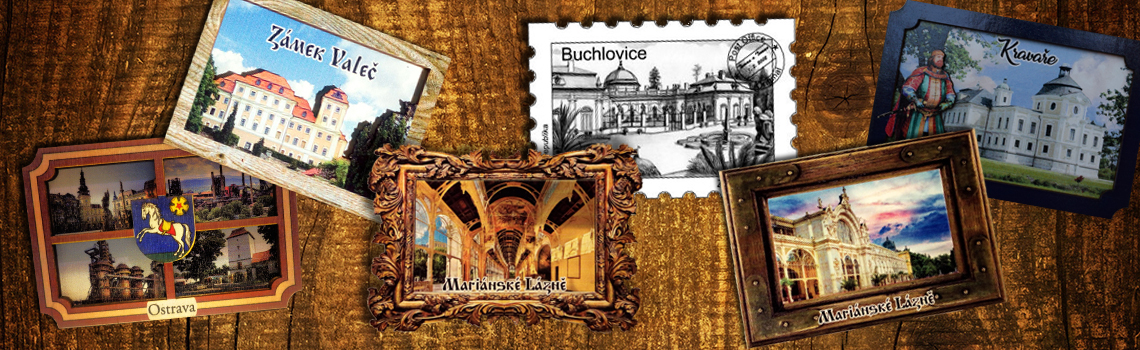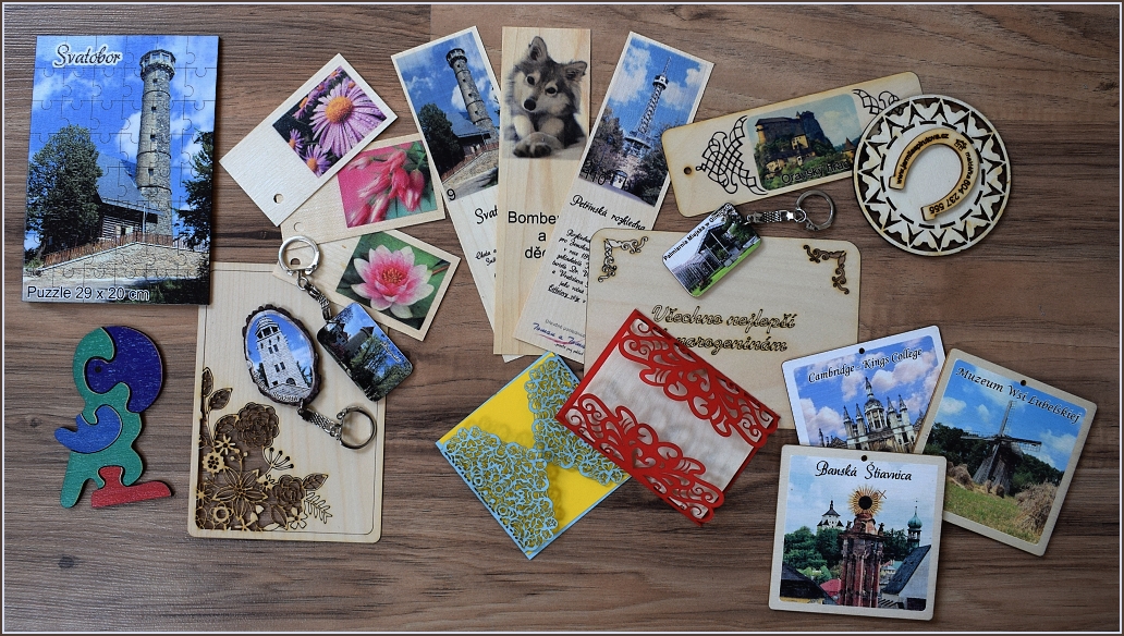 Kromě pohlednic a magnetek nabízíme puzzle, klíčenky, visačky, záložky a jiné upomínkové a reklamní předměty.